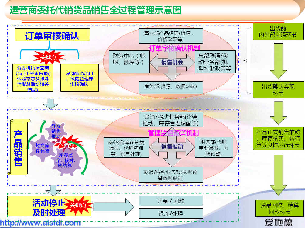 运营商部 | 获取运营商的终端销售数据;对代销仓库存进行分类;对结算回款负直接责任。 | 制定本职能部门在代销管理方面的规章制度,对机构运营商系统的良性运作负管理责任。 |